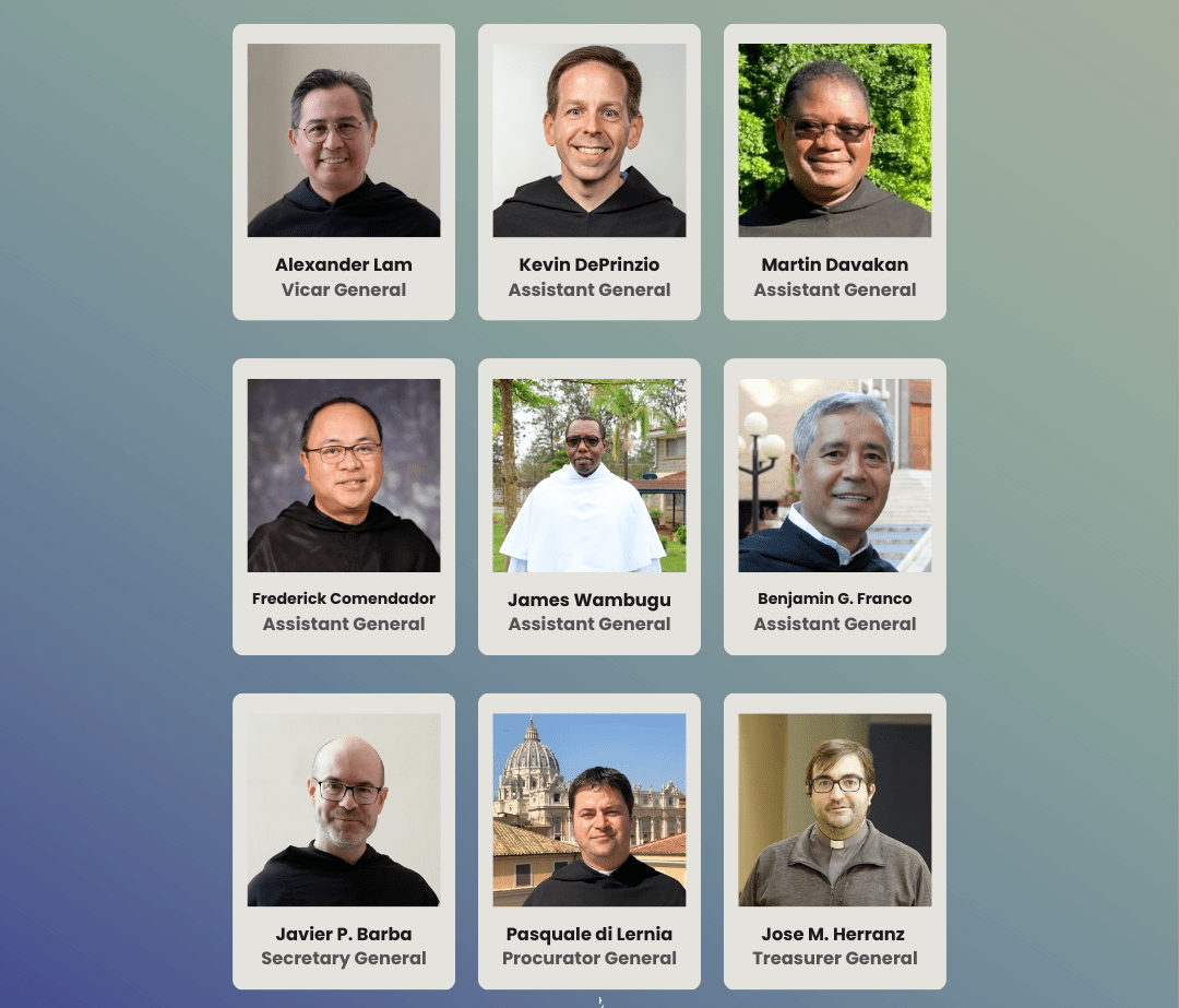 During the ongoing General Ordinary Chapter, the Order has elected its new officials to serve in collaboration with the newly elected Prior General, Fr. Joseph Farrell, who was chosen a few days ago. This morning, the Chapter elected the following officials: Vicar General:Fr Alex Lam (Peru) Assistants General:Fr Kevin De Prinzio (USA)Fr Martin Davakan (Belgium)Fr Frederick Comendador (Philippines)Fr James Wambugu (Kenya)Fr Benjamín García Franco (Mexico) Other Appointments:General Secretary: Fr Javier